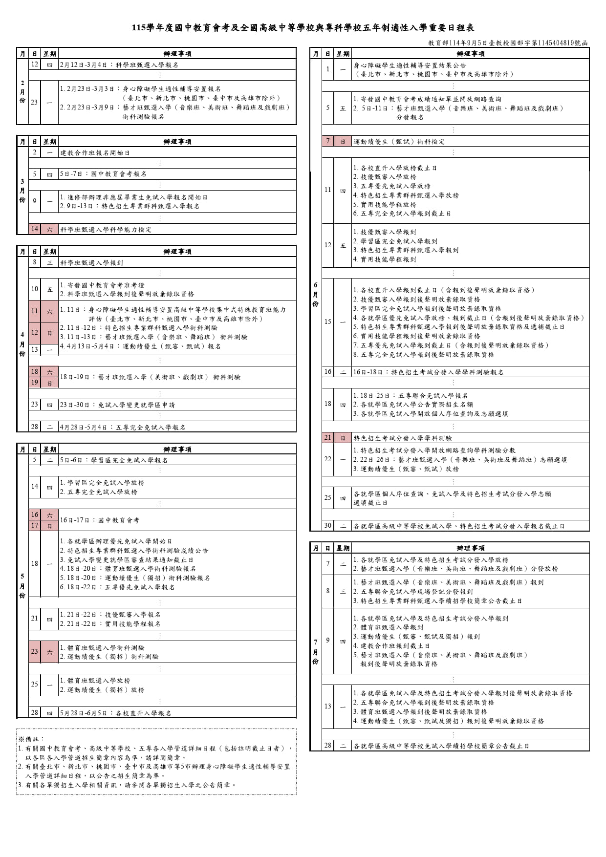 重要日程表